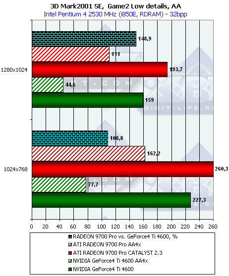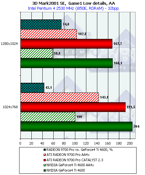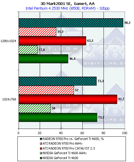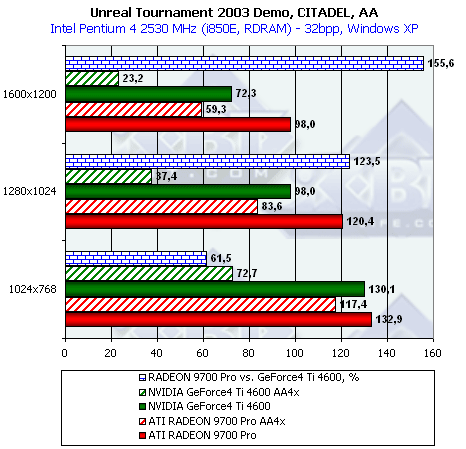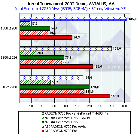 - Повторим, что самые высокие проценты преимущества RADEON 9700 получены в режиме АА, что вполне объяснимо наличием 256-битной шины обмена с памятью;