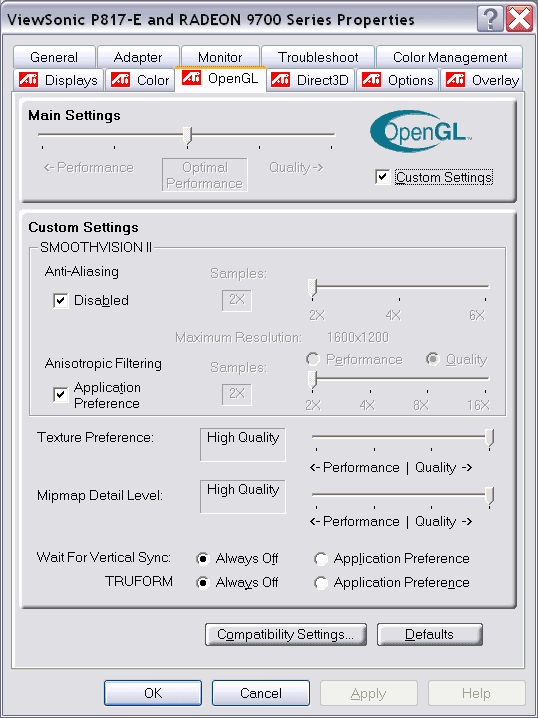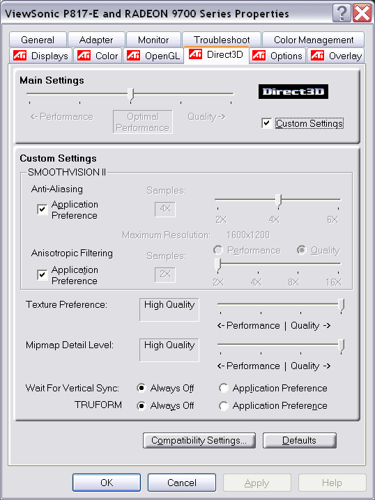 Новые драйверы из серии CATALYST версии 2.3, по номеру версии 2D (что нам более привычно) 6.166, имеют немного измененные настройки, впрочем, из новшеств возможность регулировки TRUEFORM: