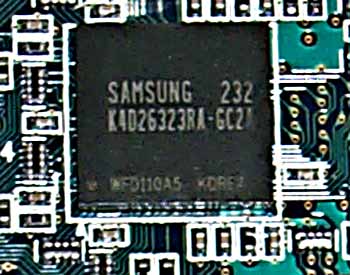 | На карте установлены микросхемы памяти Samsung марки K4D26323RA-GC2A, форм-фактора BGA. Максимальная частота работы 350 (700) МГц, поэтому можно сделать вывод, что время выборки 2,8 нс. По умолчанию память работает на частоте 310 (620) МГц | ![]() |