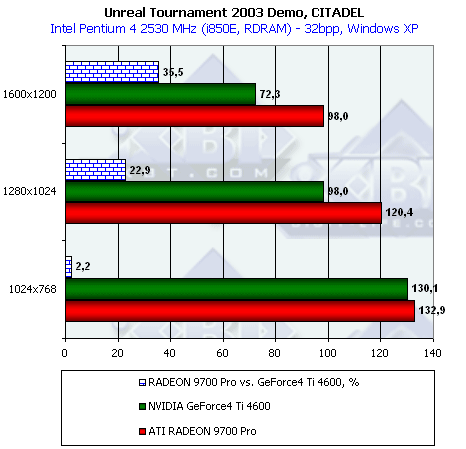 В рамках данного материала мы не будем проводить анализ изменений производительности RADEON 9700 Pro на новых драйверах на базе ряда игровых тестов (что мы использовали ранее). Оценим лишь производительность в Unreal Tournament 2003 DEMO, релиз которого мы наконец-то мы могли лицезреть — да и то, совсем недавно. А остальные игровые тесты мы проанализируем в следующем нашем материале, посвященном RADEON 9700 Pro от CP.Technology (там же и подробно рассмотрим еще раз вопросы качества).
