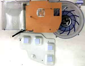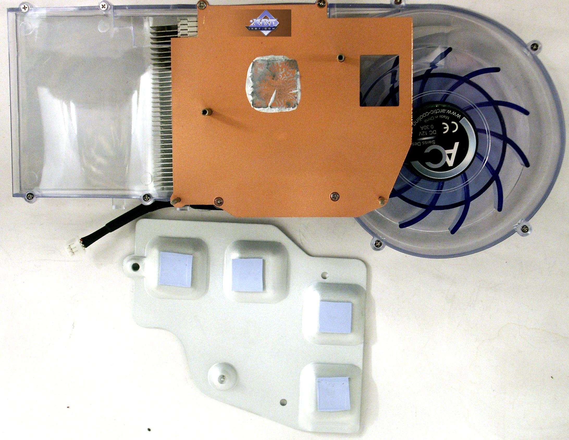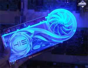Фирменное устройство от Arctic Cooling. В принципе, такие кулеры можно купить и отдельно, они продаются. Но в данной реализации от HIS есть изюминка: пластиковый прозрачный кожух покрыт краской, светящейся в ультрафиолете (кстати, без ложной скромности могу сказать, что такой совет разработчикам дал ваш покорный слуга). Итак, кулер состоит из медного основания, прижимающегося к ядру и микросхемам памяти (через термопрокладки), к которому припаян пластинчатый радиатор. Поверх последнего проходит пластиковый воздуховод (кожух), на одном конце которого турбина, закачивающая в него воздух, на другом — раструб, через который горячий воздух выбрасывается наружу из системного блока. Понятно, что воздух проходит через радиатор, охлаждая его. Уникальная особенность такой системы состоит в крайне низком шуме (очень грамотно продумана конфигурация турбины) при очень хорошей эффективности охлаждения. Частота вращения — от 2500 до 6000. Посмотреть видеоролик и оценить шум при старте системного блока можно по этой ссылке (1,3 МB, AVI DivX 5.1). А также сравнить с фоновым шумом без видеокарты (740 kB, AVI DivX 5.1). Разумеется, за эффективность и тишину надо платить. И такой жертвой является ширина системы охлаждения, при которой второй слот после PCI-E x16 остается занятым (впрочем, пока на львиной доле системных плат там находится PCI-E x1, который не используется в настоящее время, да и вряд ли вскоре будет чем-то занят). Поэтому это даже не минус кулера, а просто некая особенность. | ![]() |