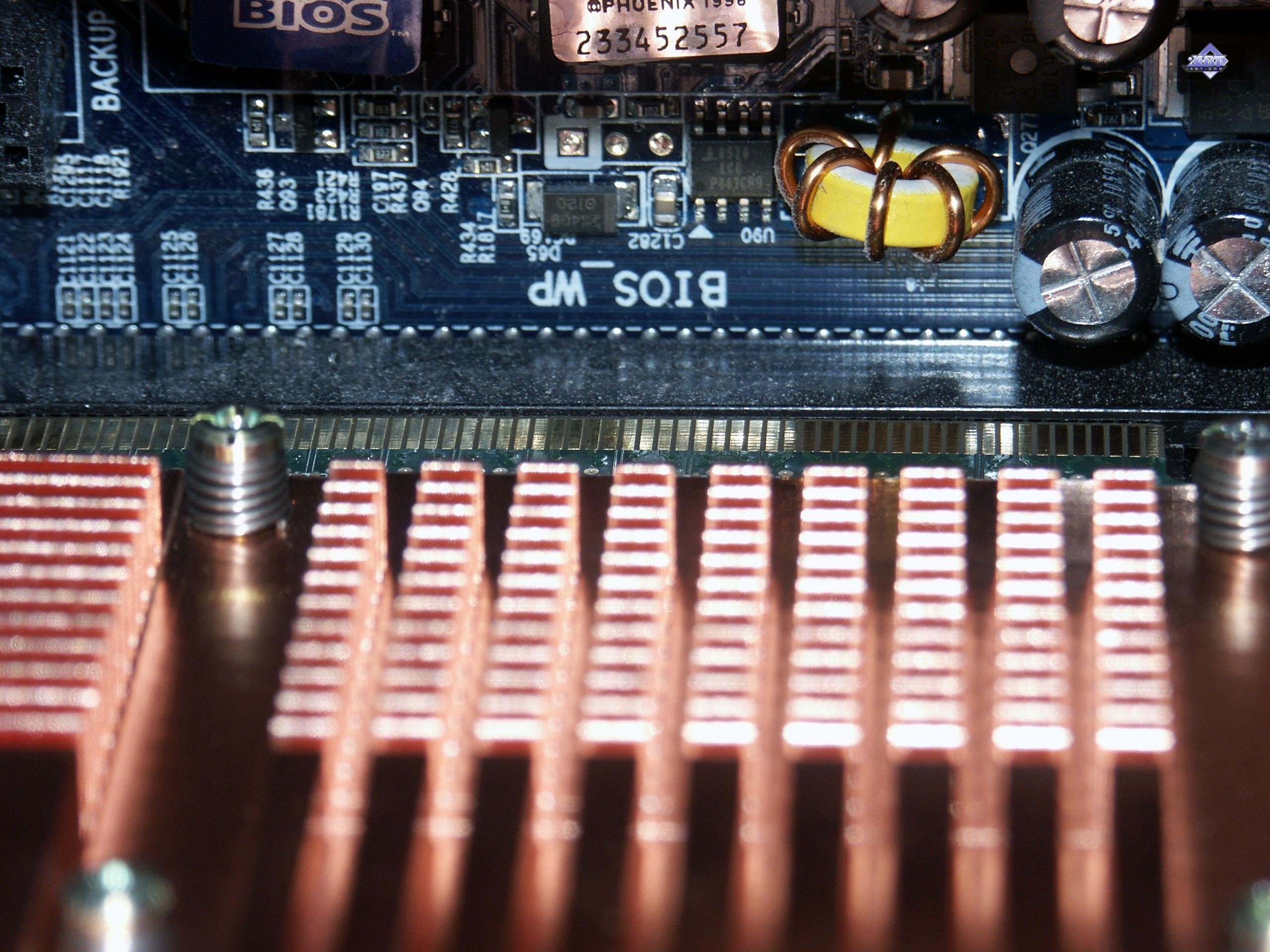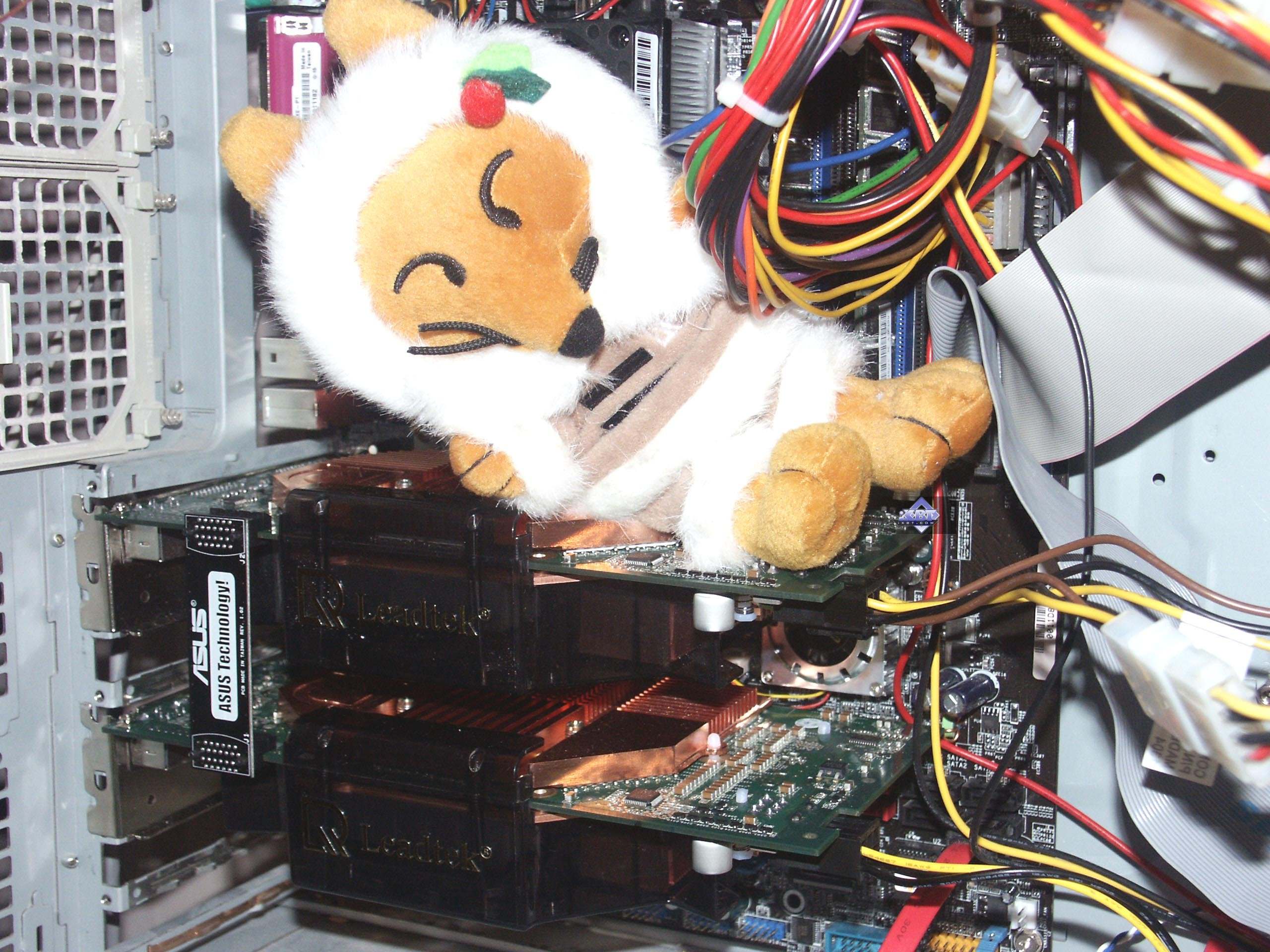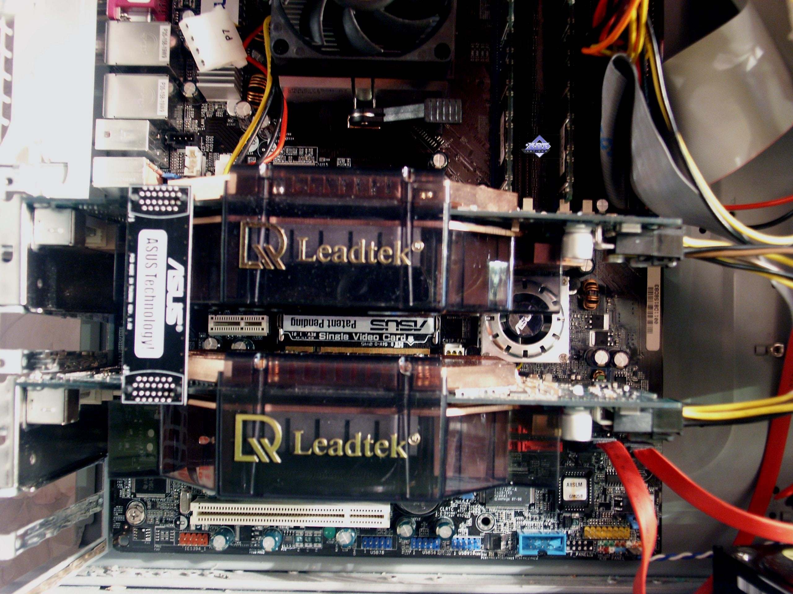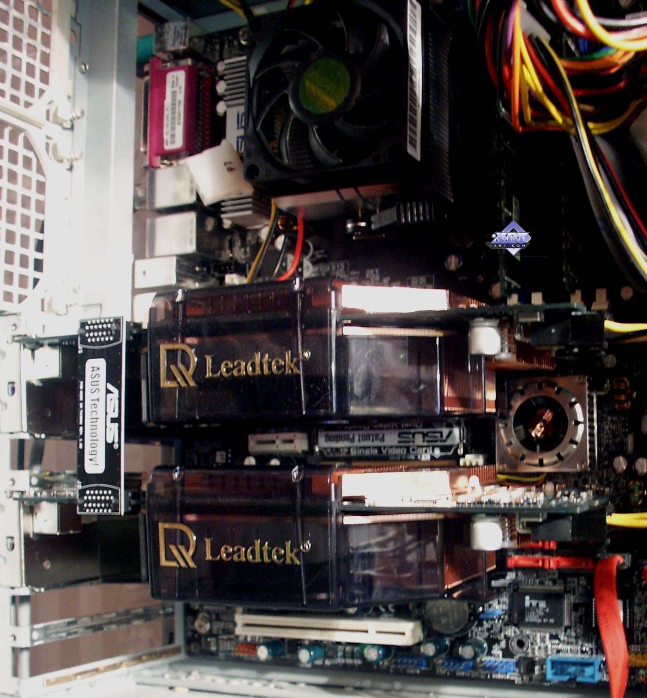 То есть радиатор с задней стороны нижней карты упирается в радиатор верхней карты, и примерно миллиметров 5 не хватает для того, чтобы карты смогли установиться вместе в системную плату, где между PCI-E x16 всего 1 слот. На сегодня существует только одна материнка, где такие слоты разнесены между собой дальше: это ASUS A8N-SLI: