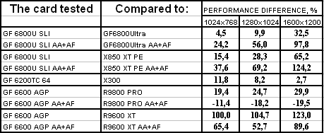 SLI почти ничего не дает (даже в 1600х1200 с АА+АФ все уперлось в системные ресурсы), 6600 AGP явно проиграл битву, а 6200TC из своей ямы и не выбирался.