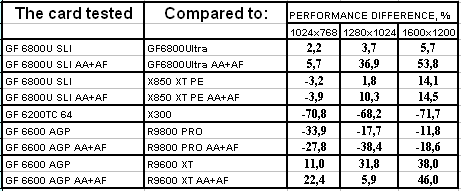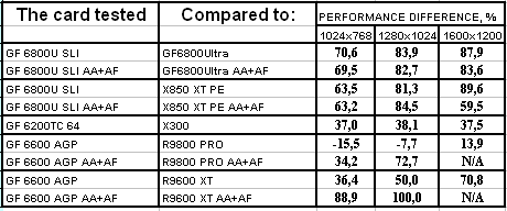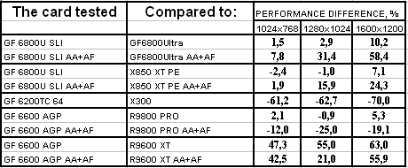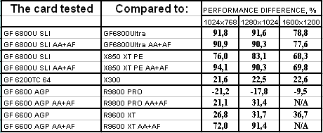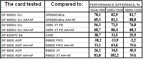 Как можно догадаться, перевес над X850 XT PE у SLI благодаря тому, что одиночная карта GeForce 6800 Ultra смогла так опередить соперника.