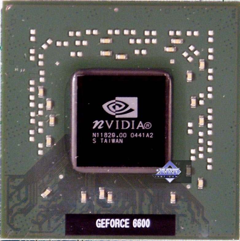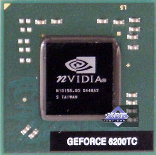 Теперь маятник нашего рассмотрения относим резко в другую сторону, и получаем… GeForce 6200 TurboCache. Да, это по сути Low-End последнего поколения, то есть на базе той же архитектуры были созданы чипы, где урезаны конвейеры и шина обмена с памятью. И в результате вышел в свет NV44, то бишь тот же NV43 (GeForce 6600), урезанный вдвое (4 пиксельных и 3 вершинных конвейера), и снабженный 64-битным контроллером обмена с памятью (то есть 128 бит тут уже невозможно в принципе).