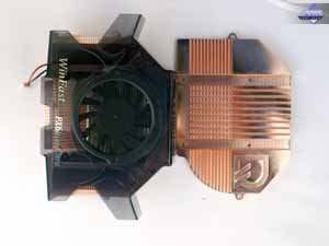 Система охлаждения также состоит из двух частей, но иных: большого радиатора и малого. Большой вместе с вентилятором в центре установлен на лицевой стороне карты. Это массивное устройство из медного сплава (поэтому его вес около 600г), по толщине занимает два слота, сверху и с лицевой стороны закрыт защитным полупрозрачным пластиком с решеткой в том месте, где вентилятор. Малый радиатор не имеет вентилятора и установлен на обороте карты, призван помогать в охлаждении самой PCB, особенно в местах, где на лицевой стороне установлены микросхемы памяти. Изготовлен также из медного сплава, поэтому суммарно видеокарта весит около 1 кг. Частота вращения вентилятора — от 3500 до 6000 оборотов в минуту, стартовый шум весьма сильный. Однако он утихает, и обороты снижаются только после 3-4-х минут работы системного блока и снова вырастают при нагреве (работе в 3D). Посмотреть видеоролик и оценить шум можно по этой ссылке (4.3MB, AVI DivX 5.1). А также сравнить с фоновым шумом без видеокарты (740KB, AVI DivX 5.1). | ![]() |