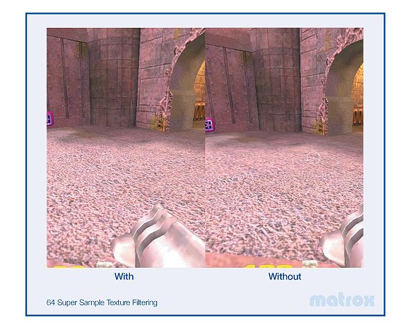 В зависимости от используемой фильтрации мы получим четыре билинейно фильтрованных, две трилинейно или анизотропно (8 отсчетов) или одну анизотропно (16 отсчетов) текстуры за такт. Соответственно, для старых, «двутекстурных» приложений анизотропная фильтрация на базе 8 отсчетов будет проходить без потери скорости. Но, технология анизотропной фильтрации близка к реализации от NVIDIA, а вот практически бесплатной анизотропки (на основе RIP маппинга), свойственной ATI мы у Parhelia-512 не увидим. Приведем скриншот из Quake III c максимальной анизотропией:
