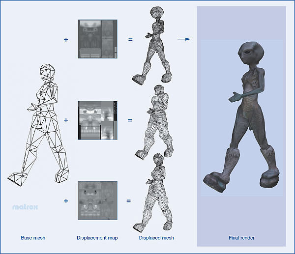 Карта смещений отвечает за «грубый» рельеф, смещая вершины треугольников в направлении нормали, заданной для этой вершины. При необходимости, совместно с картой смещений можно использовать и традиционную карту рельефа (bump map) для создания более тонких «попиксельных» деталей.