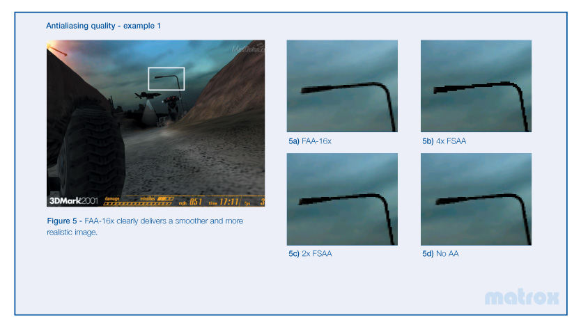 Технология полноэкранного сглаживания, реализованная в Parhelia-512 на сегодняшний день аналогов не имеет. Посему, должна быть похвалена, и несомненно может считаться достаточно близкой к идеалу. По своей сути, это суперсэмплинг, до 16 отсчетов на одну точку экрана. Но, выполняется он ТОЛЬКО (!) для точек принадлежащих краям полигонов (всего 3..5% типичной сцены):