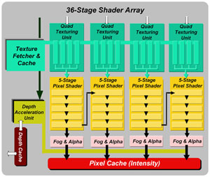 - Пиксельные шейдеры версии 1.3 (Pixel Shader 1.3), 4 текстурных + 5 комбинационных стадий на каждом пиксельном конвейере, с возможностью объединения конвейеров попарно (получаем 2 конвейера по 10 комбинационных стадий)