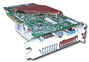 | Карта основана на AGP X2/4/8 интерфейсе, имеет 128 мегабайт DDR II SDRAM памяти, расмещенной в 8-ми микросхемах по обеим сторонам PCB. Интерфейс обмена с памятью 128бит. На карте установлены микросхемы памяти Samsung марки K4N26323AE-GC1K, форм-фактора BGA. Максимальная частота работы — 550 (1100) МГц, поэтому можно сделать вывод, что время выборки 1.8 нс. По умолчанию память работает в 3D на частоте 500 (1000) МГц, в 2D — 300 (600) МГц. | ![]() |