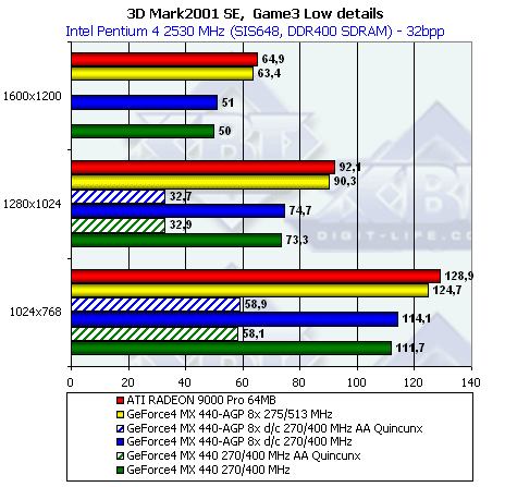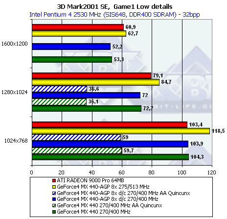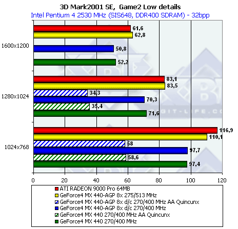 Картина почти аналогичная, за исключением того, что новый MX 440 сумел-таки обогнать RADEON 9000 Pro.