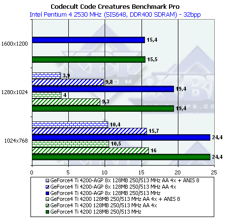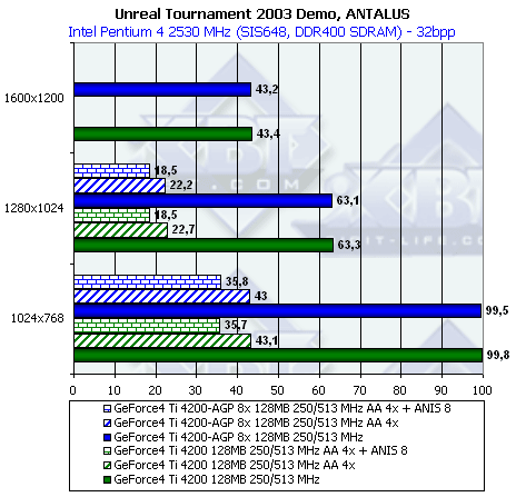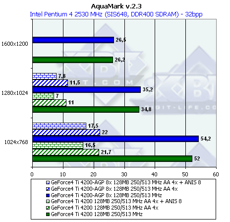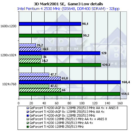 Несмотря на то, что этот тест очень сложен, (он таковым и задумывался, чтобы проверить не только работоспособность современных ускорителей при активных функциях DX8.1, но и быстроту работы с ними), 128-ми мегабайт у GeForce4 Ti 4200 with AGP8x вполне хватает для всего и вся, поэтому никакой разницы между ним и Ti 4200 мы не видим.