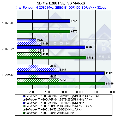 3DMark2001, как и все современные игры, "заточен" под активное использование локальной памяти видеокарты, а не под перегон информации по AGP, а, как мы уже убедились, объема видеопамяти у современных карт более чем достаточно для подобных тестов.
