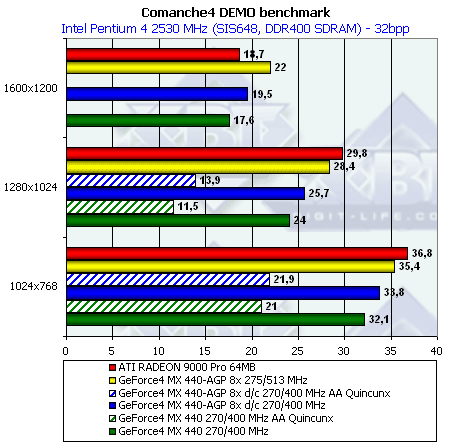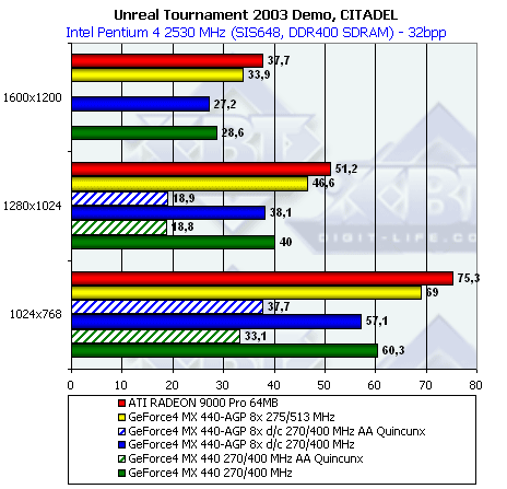 Интересно, что игры под OpenGL (кроме Quake3) более интенсивно используют AGP, и в данном случае мы видим, как NV18 выиграла сражение с MX 440, особенно в 1600х1200. Как и в случае Quake3, RADEON 9000 Pro проиграл соперникам, хотя выглядит много лучше, чем в том тесте.