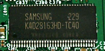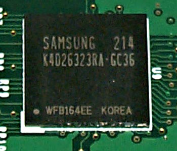 | На карте установлены микросхемы памяти Samsung со временем выборки 4ns. Максимальная частота работы 250 (500) МГц, но по умолчанию память работает на частоте 256 (513) МГц. Чип тактован на 250 МГц | ![]() |