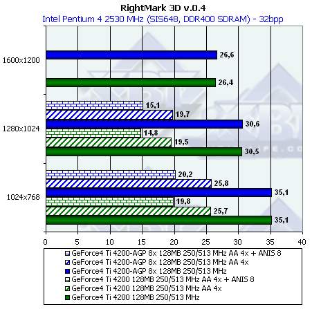 НО! Если даже в следующем году появятся такие игры, которые либо будут использовать объем текстур для сцены выше 100-150 мегабайт, либо будут "заточены" под использование увеличенной пропускной способности AGP, то нынешние NV18/NV28 получат второе дыхание и смогут еще как-то увеличить свою производительность (к тому времени, думаю, Ti 4200 опустится до уровня low end).