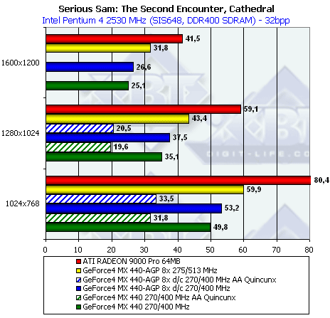 - Serious Sam: The Second Encounter v.1.05 (Croteam/GodGames) OpenGL, мультитекстурирование, Grand Cathedral demo, настройки тестирования: quality, S3TC OFF