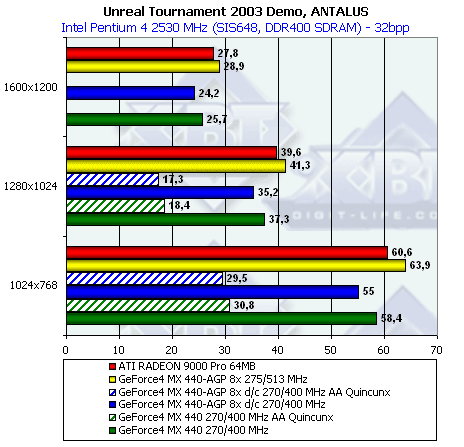 - Unreal Tournament 2003 Demo (+Patch 1080) (Digital Extreme/Epic Games) Direct3D, Vertex Shaders, Hardware T&L, Dot3, cube texturing, качество по умолчанию, тесты FlyBy CITADEL и FlyBy ANTALUS