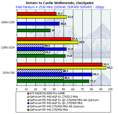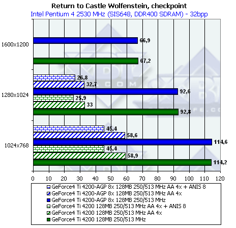- Return to Castle Wolfenstein (MultiPlayer) (id Software/Activision) OpenGL, мультитекстурирование, Checkpoint-demo, настройки тестирования все на максимально возможном уровне, S3TC OFF, конфигурации можно скачать тут
