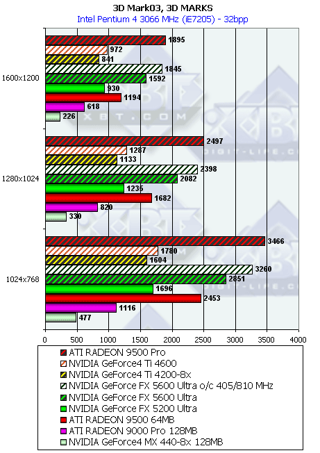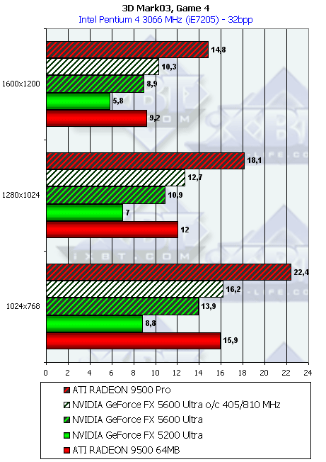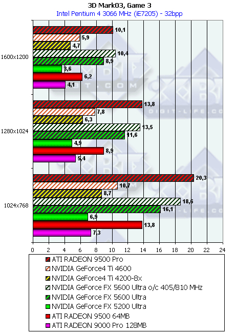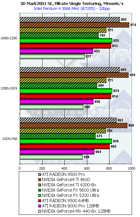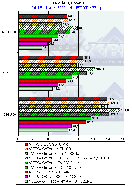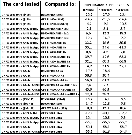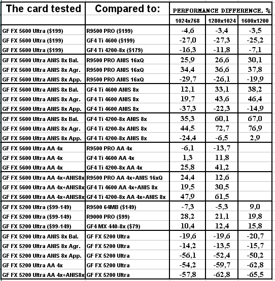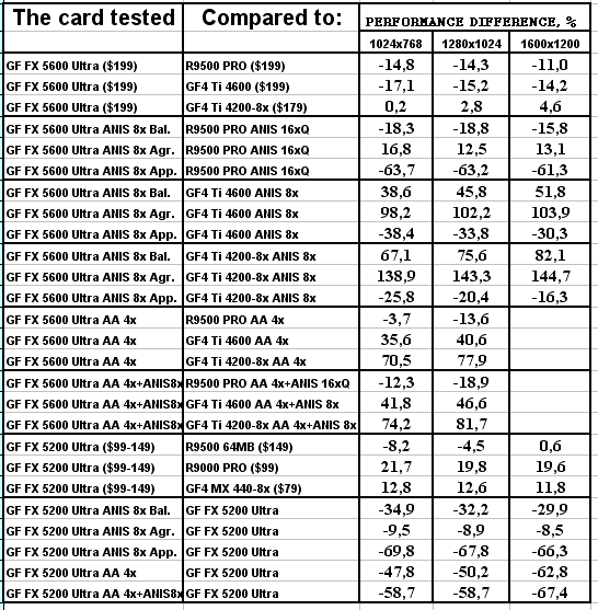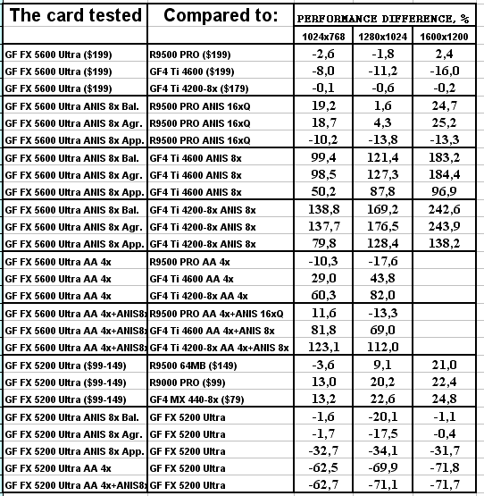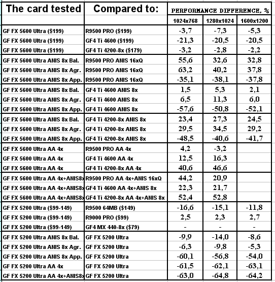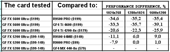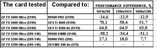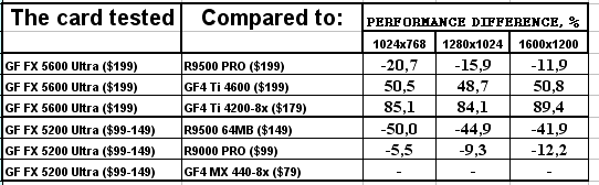 Думаю, что в таблицах соотношений все данные имеются, поэтому комментировать нет смысла. Замечу лишь, что мы провели сравнение GeForce FX 5200 Ultra и с RADEON 9500 64MB, хотя по позиционированию эти карты находятся в разных секторах. Однако начальная цена самой дорогой карты FX 5200 Ultra возможно будет до $149, а ныне по таким ценам можно купить RADEON 9500 64MB.