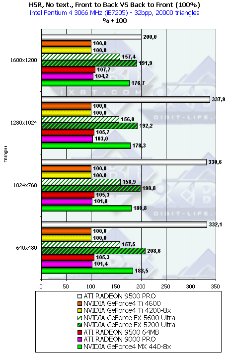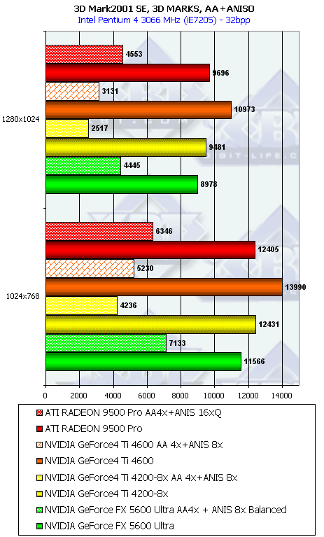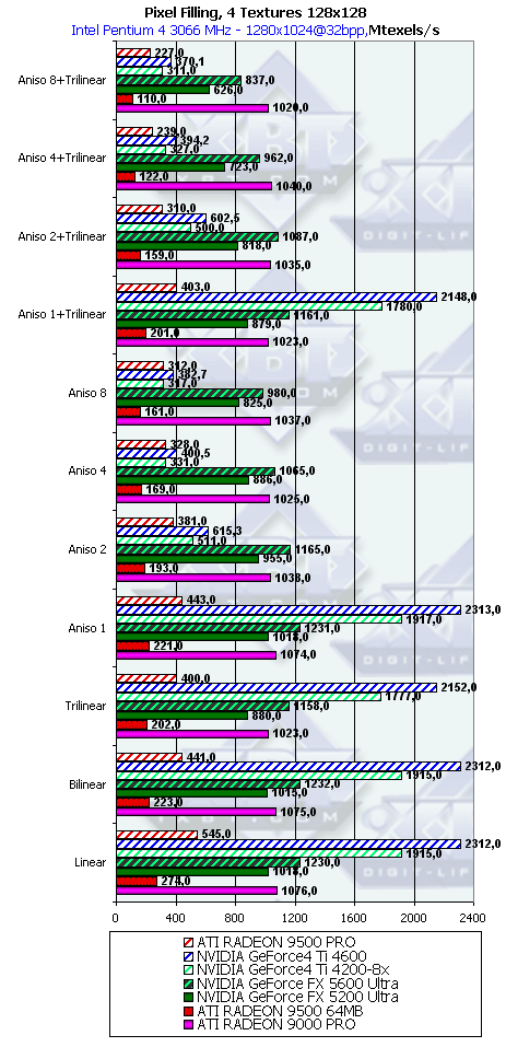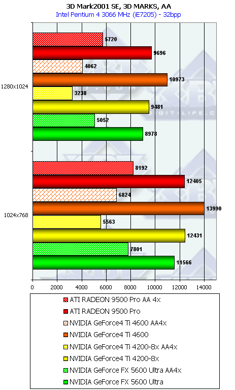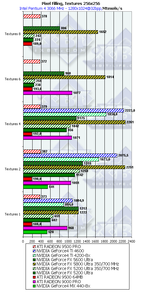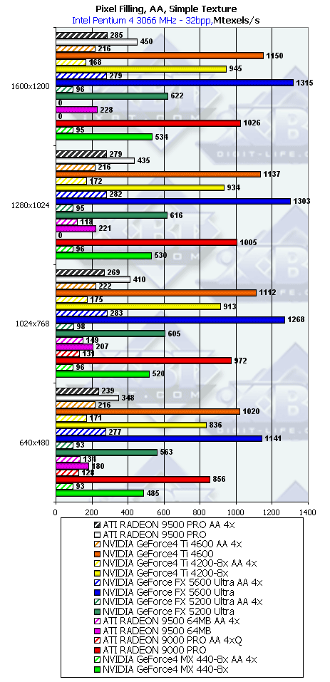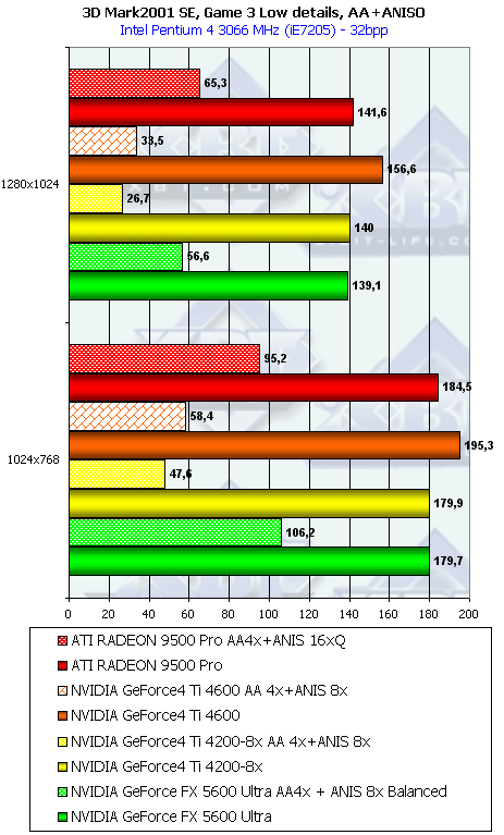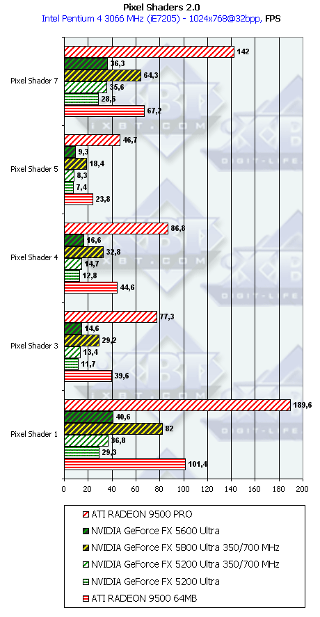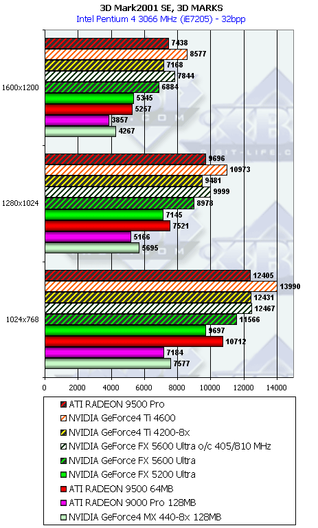 Думаю, что в таблицах соотношений все данные имеются, поэтому комментировать нет смысла. Замечу лишь, что мы провели сравнение GeForce FX 5200 Ultra и с RADEON 9500 64MB, хотя по позиционированию эти карты находятся в разных секторах. Однако начальная цена самой дорогой карты FX 5200 Ultra возможно будет до $149, а ныне по таким ценам можно купить RADEON 9500 64MB.