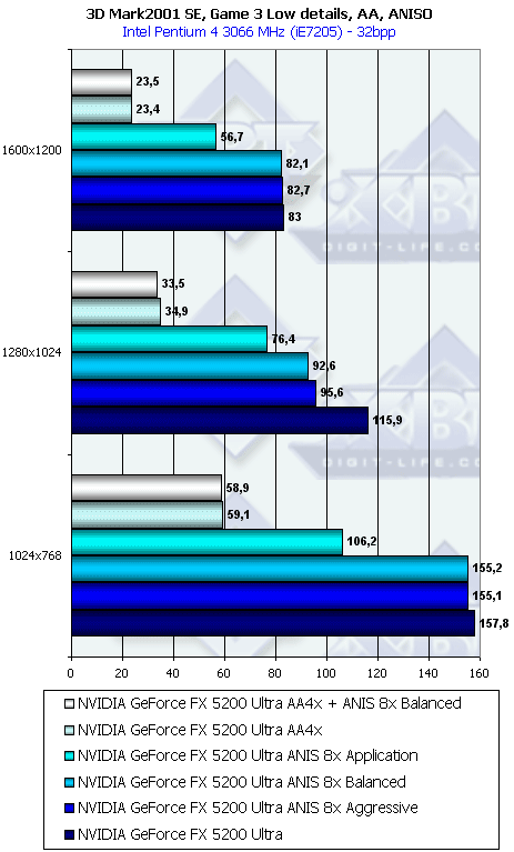 Работу анти-алиасинга мы в этом материале рассматривать не будем, поскольку все подробности есть уже в статье по GeForce FX 5800. Замечу лишь, что в ряде режимов работы АА скриншоты корректно снять невозможно из-за того, что АА обрабатывается неким постфильтром уже после передачи всех данных из фрейм-буфера на RAMDAC, а любой скриншот — это слепок копии содержимого фрейм-буфера.