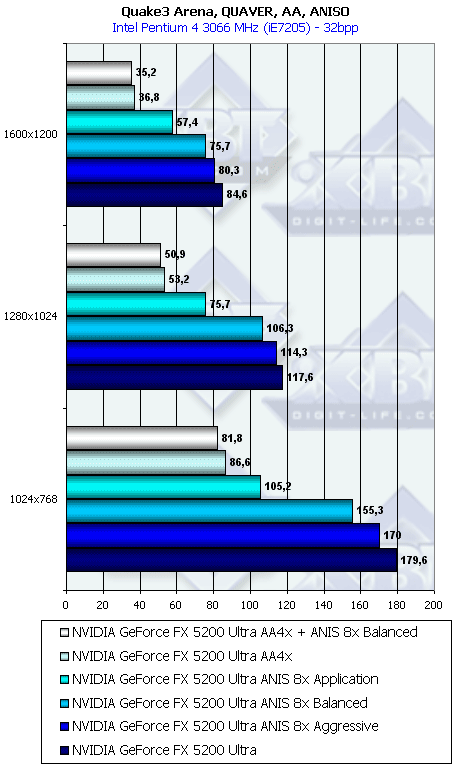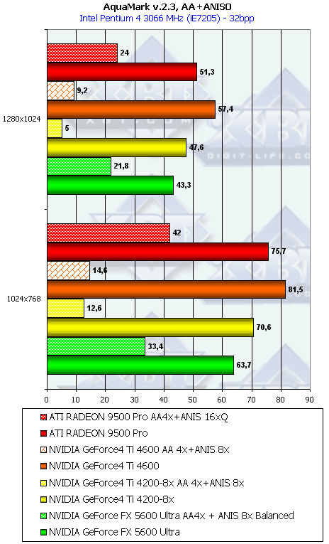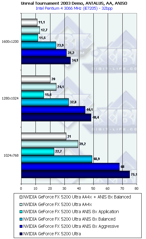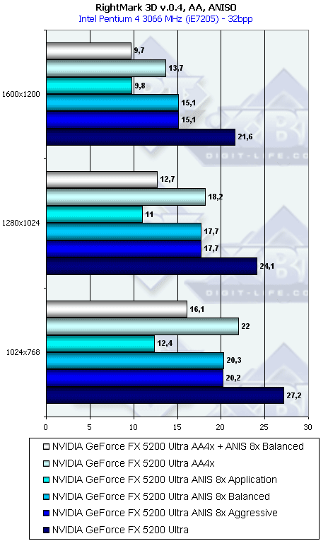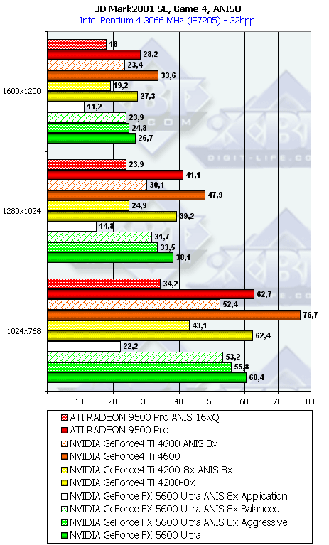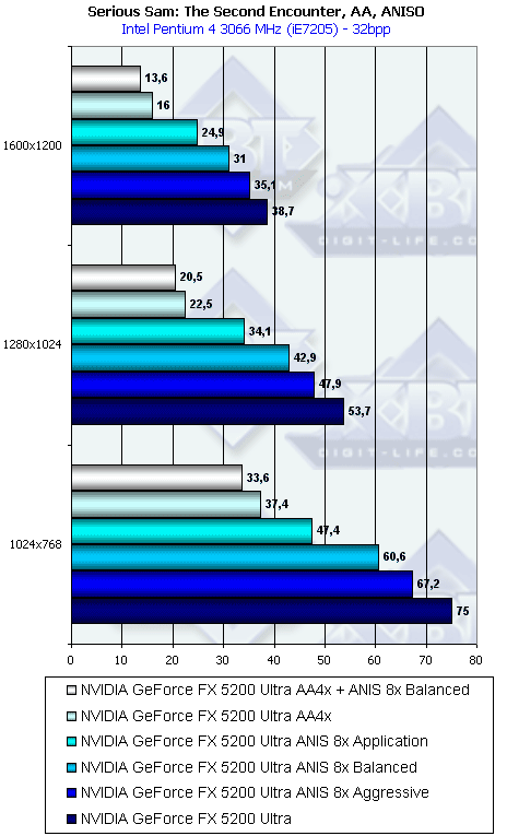 Напомню, что у всех группы NV3x есть по сути три разновидности анизотропной фильтрации: зависящая от приложения, сбалансированная между производительностью и качеством и агрессивная в плане предпочтения производительности качеству. По умолчанию используется сбалансированная разновидность. Мы тестировали скорость как этого подвида, так и "агрессивного". Замечу, что в разных версиях драйверов название режима Aggressive может заменяться на Performance.