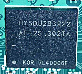 | На картах установлены микросхемы памяти Hynix марки HY5DU283222-AF25, форм-фактора BGA. Максимальная частота работы — 400 (800) МГц, время выборки 2.5 нс. По умолчанию память работает у GeForce FX 5600 Ultra на частоте 350 (700) МГц, у GeForce FX 5200 Ultra — 325 (650) МГц. | ![]() |