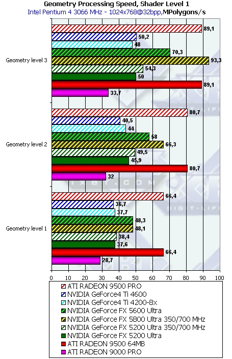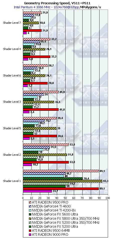 - Аппаратный геометрический процессор NV31 и NV34 имеет одинаковую (!) вычислительную производительность, меньшую более чем вдвое по сравнению с NV30. Все отличия между NV31 и NV34 в плане скорости обработки геометрии обусловлены контроллерами памяти, КЭШами и размером внутренних очередей.
