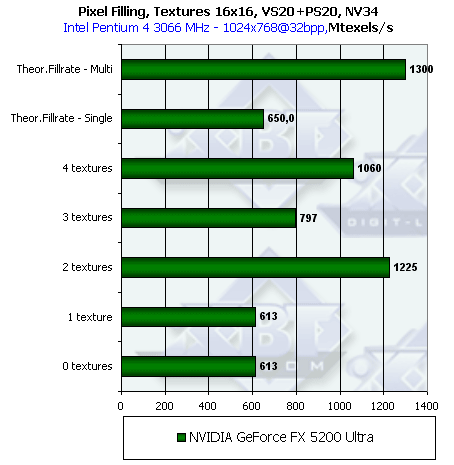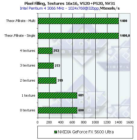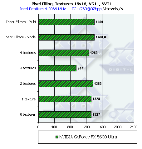 В NV31 удалось компенсировать самый спорный момент NV30 — этот чип может работать как в конфигурации 4х1, так и в конфигурации 2х2 в зависимости от числа текстур и задачи. Таким образом, NVIDIA исправила серьезный недостаток NV30, потенциально влияющий на производительность в старых и современных приложениях интенсивно накладывающих одну текстуру.