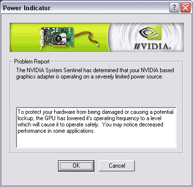 Как мы видим, дизайн у обеих карт совершенно одинаковый, PCB короче чем у GeForce FX 5800 и GeForce4 Ti 4600. Тем не менее, внешнее питание требуется. Мы видим у NV31 и NV34 есть такие же 4-х пиновые разъемы для поключения питания от БП, как у и NV30. Если его не подключить, то при загрузке операционной системы драйвер выдаст сообщение: