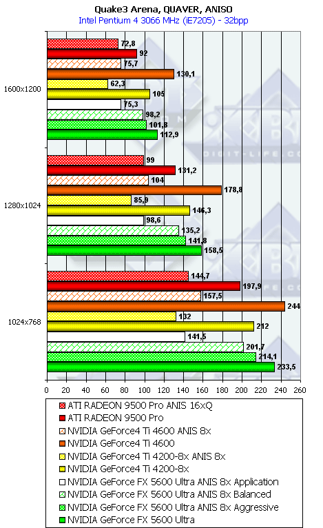 Сразу отмечу, почему мы использовали в наших тестах настройки анизотропии 16х у карт от ATI и 8х у карт от NVIDIA. Никакой дискриминации в отношении карт от ATI нет! Алгоритмы работы этой функции у ATI и NVIDIA очень различаются (об этом мы говорили подробно в нашем материале по NV30), поэтому сопоставлять только цифры "8" неразумно. Критерий один: максимально возможное качество. У NVIDIA по ее "счетчику" — это 8х, а у ATI — 16х. Скриншоты мы уже приводили, и не один раз. К тому же, интересно будет узнать, как сопоставляются разные режимы работы анизотропии (Application, Balanced, Aggressive) от NVIDIA с максимально качественным режимом от ATI, тем более, что опять же, скриншоты мы уже приводили, и читатель может оценить соотношение скорости и качества (милости просим в обзор NV30 за скриншотами оценки качества анизотропной фильтрации).