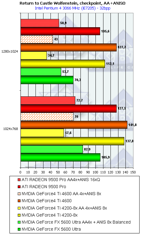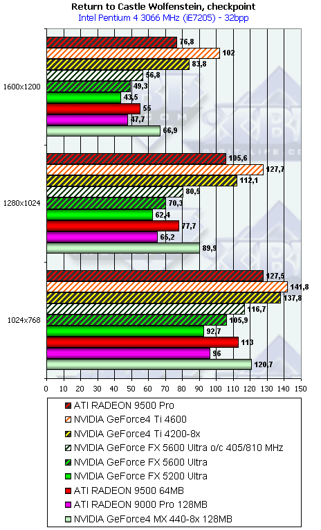 - Return to Castle Wolfenstein (MultiPlayer) (id Software/Activision) — OpenGL, мультитекстурирование, Checkpoint-demo, настройки тестирования — все на максимально возможном уровне, S3TC OFF, конфигурации можно скачать тут