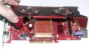 Очевидно, что плата копирует эталонный дизайн, не установлено лишь второе гнездо для внешнего питания. Кроме частот работы у этой карты есть и еще одна изюминка — система охлаждения. Она достаточно громоздкая, поэтому карта занимает два слота.