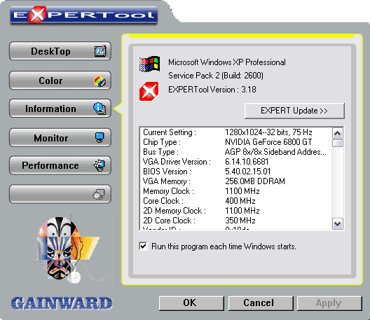 | Карта имеет интерфейс AGP x8/X4, 256 МБ памяти GDDR3 SDRAM, размещенной в 8-ми микросхемах на лицевой стороне PCB. Микросхемы памяти Samsung (GDDR3). Время выборки у микросхем памяти 2.0 ns, что соответствует частоте работы 500 (1000) МГц, на которой память и работает в обычном режиме (в Enhanced — 550 (1100) MHz). Частота работы GPU 350 MHz (в Enhanced режиме — 400 МГц). Шина обмена с памятью — 256 bit. Число пиксельных конвейеров x, число текстурных блоков — 16х1. Число вершинных конвейеров — 6. Обращаю внимание на два режима работы карты, которые становятся доступными ТОЛЬКО после установки фирменной утилиты-твикера ExperTool. | ![]() |