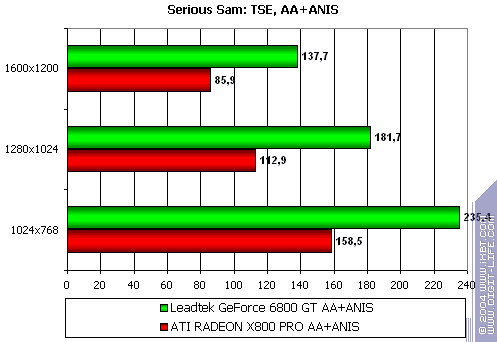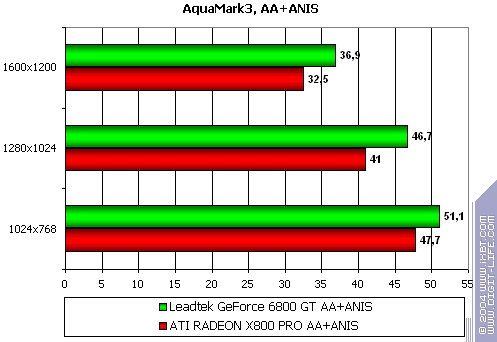 - Leadtek WinFast A400 GT TDH против ATI RADEON X800 PRO все же присудим небольшой перевес у 6800GT, поскольку скорости уже таковы, что использовать вместе АА и анизотропию можно, но осторожно :).