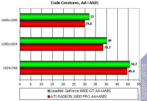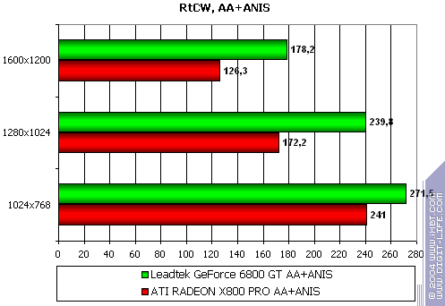 - Leadtek WinFast A400 GT TDH против ATI RADEON X800 PRO примерное равенство сил соперников, с некоторым перевесом у первого (хотя, опять-таки, вряд ли кто будет играть в подобные игры на мощных ускорителях без АА или анизотропии).