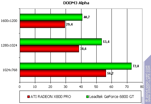 - Leadtek WinFast A400 GT TDH против ATI RADEON X800 PRO подавляющее превосходство первого над вторым! Конечно, это старая альфа-версия игры, по ней нельзя судить о том, что будет в релизе DOOM III, который появится на прилавках уже в ближайшие дни. Но все же, весьма интересно.