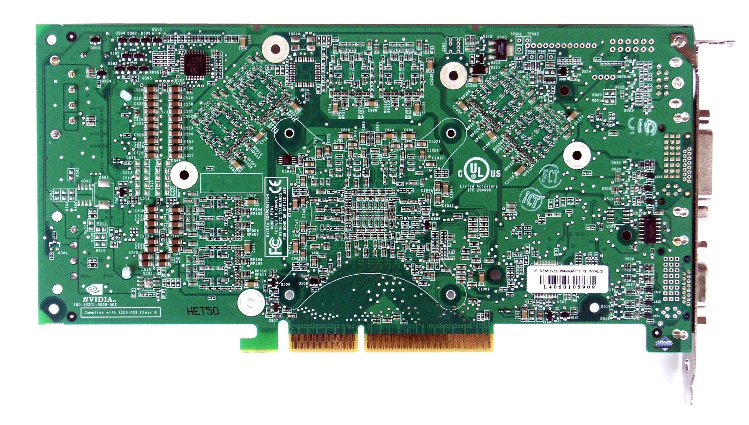 | Карта имеет интерфейс AGP x8/x4, 256 МБ памяти GDDR3 SDRAM, размещенной в 8-ми микросхемах на лицевой стороне PCB. Микросхемы памяти Samsung (GDDR3). Время выборки у микросхем памяти 2.0 ns, что соответствует частоте работы 500 (1000) МГц, на которой память и работает. Частота работы GPU 350 MHz. Шина обмена с памятью — 256 bit. | ![]() |