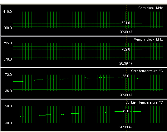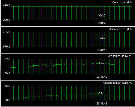 Итак, при максимальных оборотах вентилятора на GeForce 6800 мы получили такую картину изменения температуры (для снятия показаний использовалась утилита RivaTuner (автор Алексей Николайчук AKA Unwinder)):