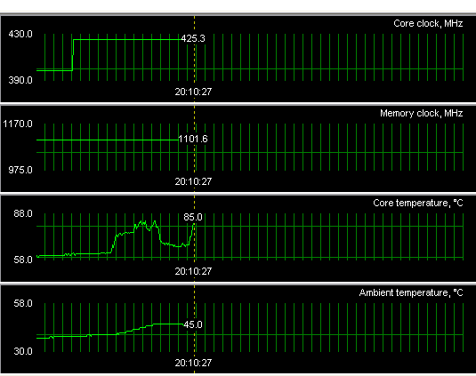 Можно заметить, что температура довольно быстро выросла до критических отметок в 85 градусов, и… карта зависла (виден обрыв измерений).