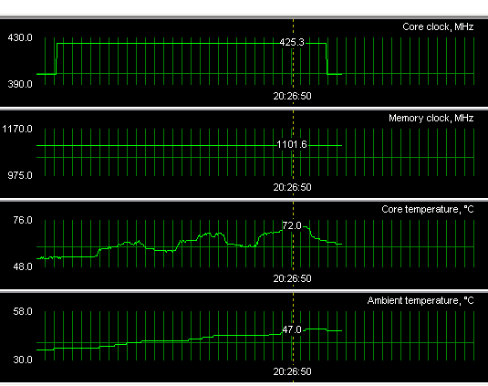 Да, здесь выше 72 градусов не поднимается. Особо отмечу, все эксперименты проводились, разумеется, внутри корпуса с отключенными вентиляторами продувки.