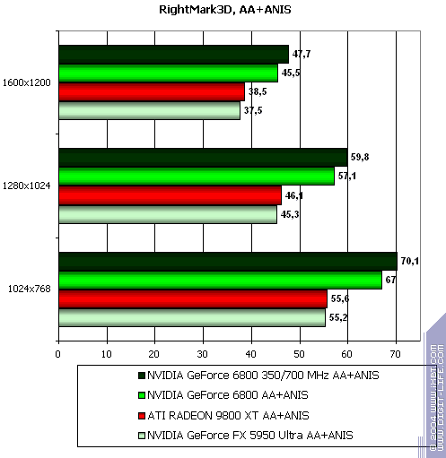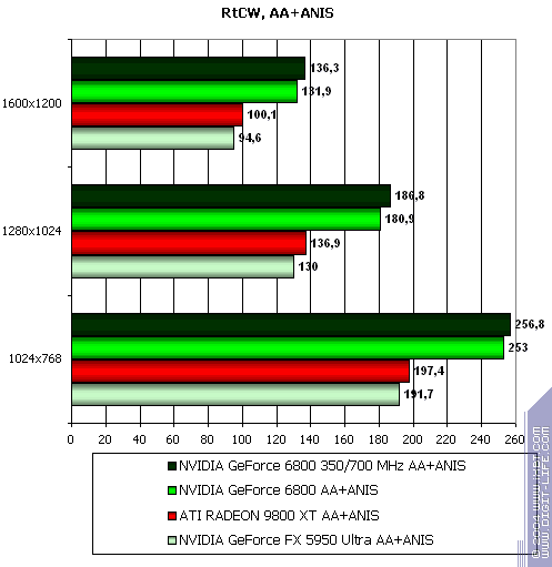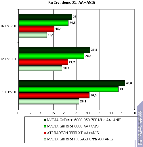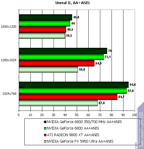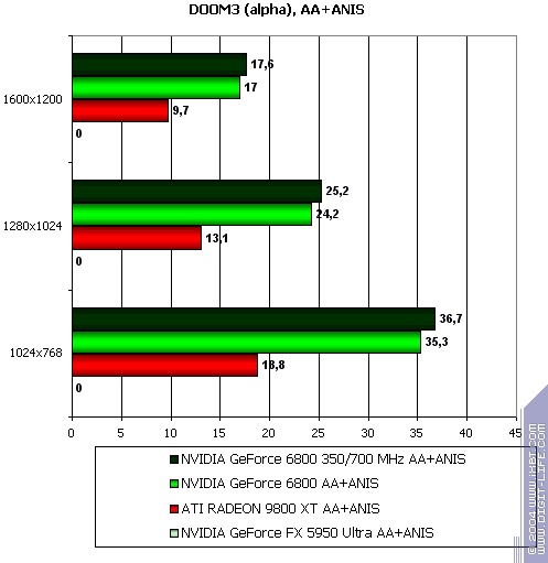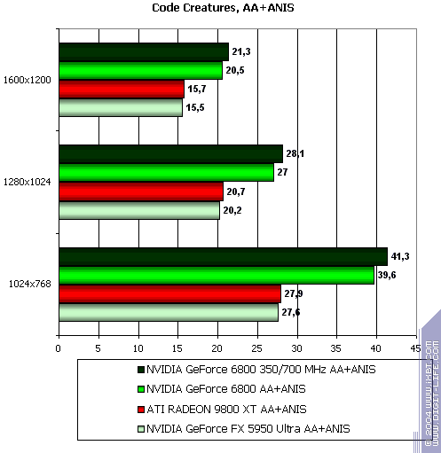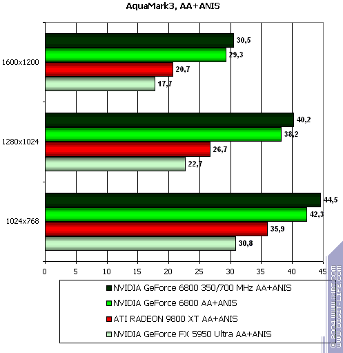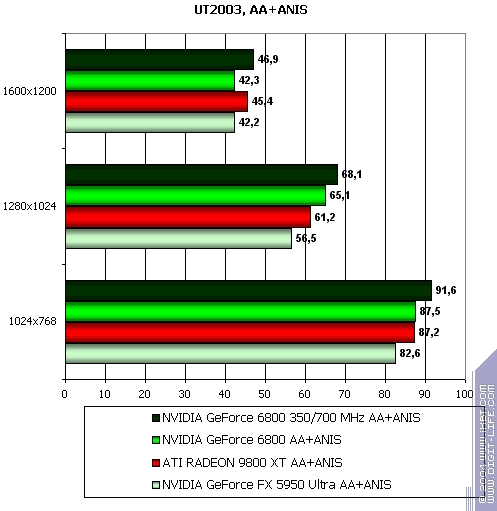 - NVIDIA GeForce 6800 против ATI RADEON 9800 XT от почти паритета без АА+АФ (уперлось все в возможности системы), до 41% прироста скорости у 6800!