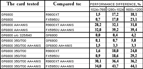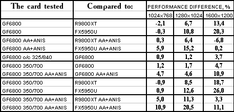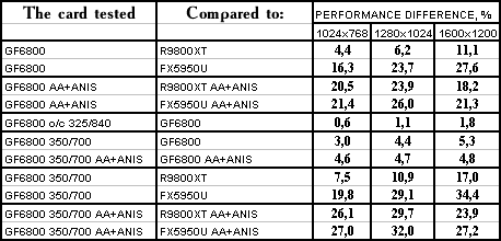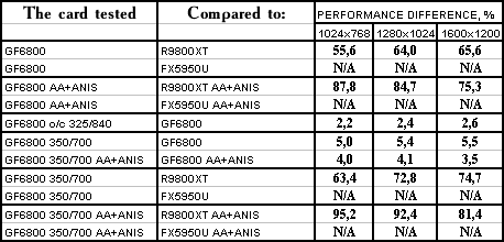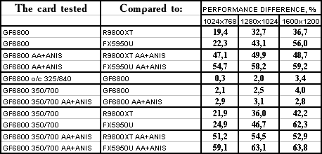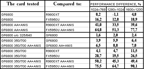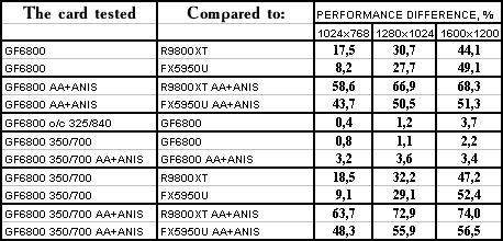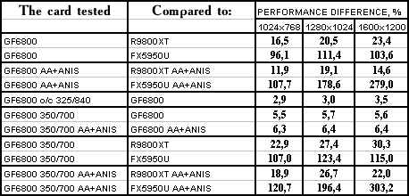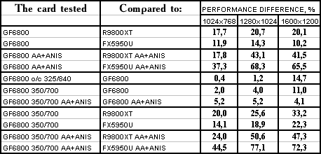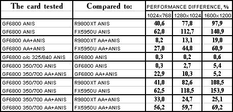 - NVIDIA GeForce 6800 против ATI RADEON 9800 XT перевес на 20-36%