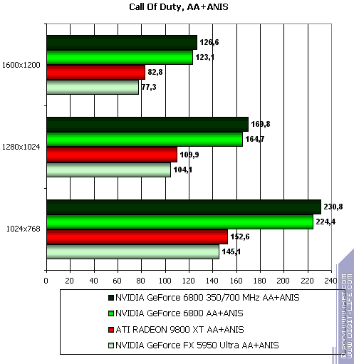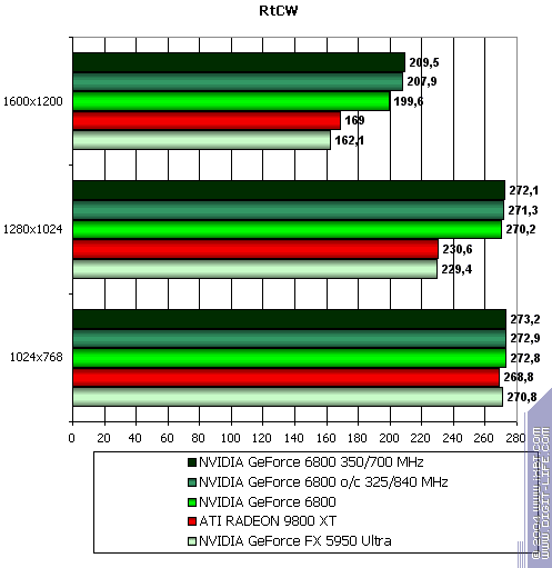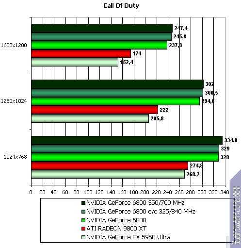 - NVIDIA GeForce 6800 c разгоном по ядру (350 МГц) небольшой прирост имеется, что характерно для данной игры.