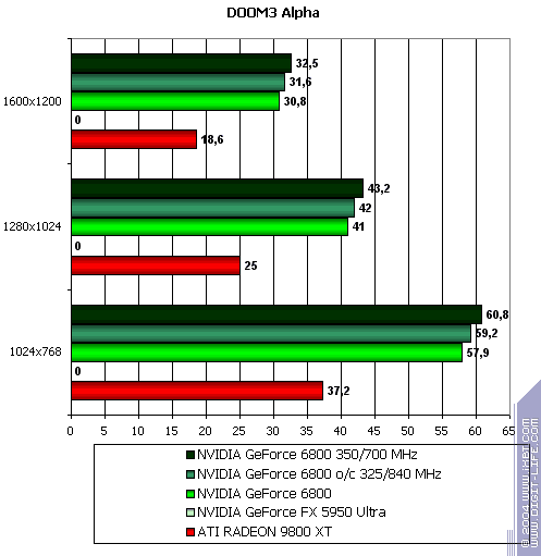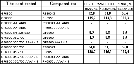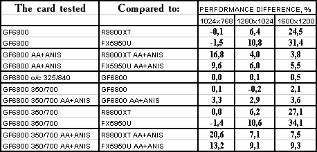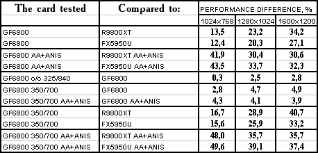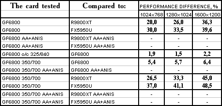 - NVIDIA GeForce 6800 против ATI RADEON 9800 XT в целом победа, хотя в тяжелых режимах чаще паритет
