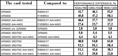 - NVIDIA GeForce 6800 против NVIDIA GeForce FX 5950 Ultra аналогично, только цифры достигают уже 30-40%