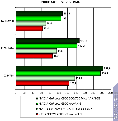 - NVIDIA GeForce 6800 против ATI RADEON 9800 XT какие-то чертыхания разницы в производительности в зависимости от разрешения (впрочем, в этой игре давно многое зависит от системных ресурсов на мощных картах)