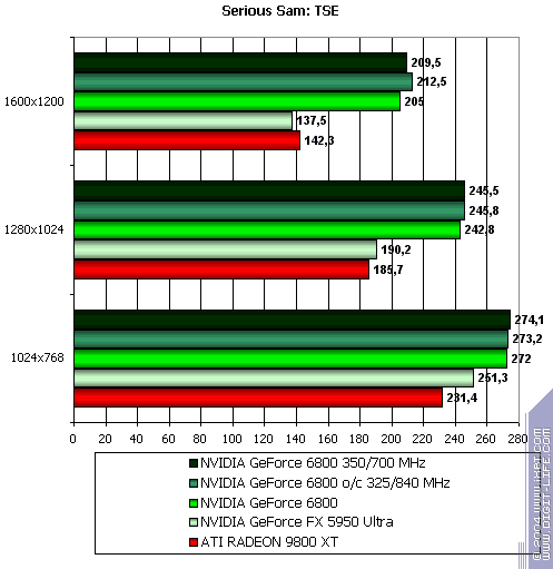 - NVIDIA GeForce 6800 c разгоном по ядру (350 МГц) прирост имеется, хоть и небольшой, игра в большей степени зависит от потенциала ядра.